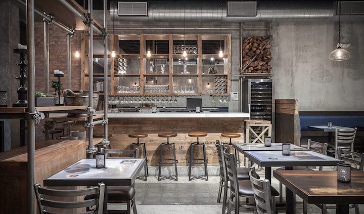 The interiors of the space were inspired by the scaffoldings seen throughout the ever-evolving New York City streets. This industrial element made usually of wooden planks and metal poles has become synonymous with the architectural experience of the city. KoDA implemented repurposed scaffolding throughout the space and turned it into a functional, yet alluring design detail for displaying carefully curated ingredients used in the kitchen and for providing additional storage space.